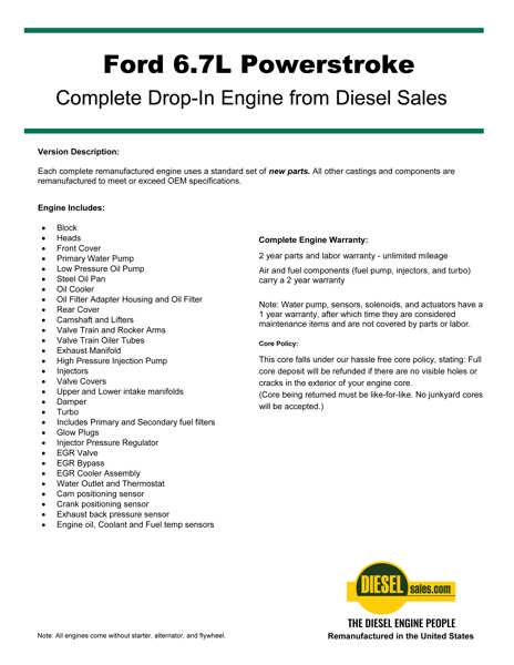 Ford, 6.7l, Powerstrok 2013-16. Fits: Ford F650-F750 Long Block R&R Only, Remanufactured Truck Engine With One Year Unlimited Mile Factory Parts & Labor Warranty. Exchange Plus $4500.00 Refundable Core Deposit. Long Block Available.