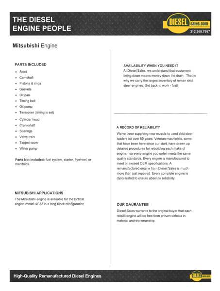 Mitsubishi 4g32 Construction / Industrial All We Need Is The Bobcat Serial Number To Quote. Complete Some Parts Not Included: Fuel System, Starter, Flywheel, Ormanifolds. Remanufactured Engine, Starting At $ 4795.00 Exchange With One Year Or 2,000 Hrs Whichever Occurs First, Factory Parts & Labor Warranty Plus $ 1150.00 Refundable Core Deposit.