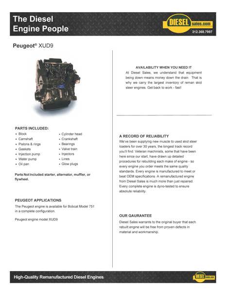 Peugeot Xud9 Construction Industrial Complete Remanufactured Engine, Starting At $8195.00 Exchange With One Year Or 2,000 Hrs (Whichever Occurs First), Factory Parts & Labor Warranty Plus $ 1150.00 Refundable Core Deposit.